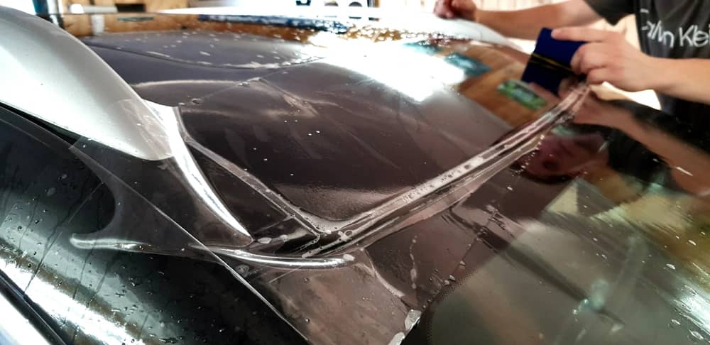 4. Во время четвертого этапа оклейки автомобиля антигравийной пленкой, мастер выгоняет мыльный раствор, располагающийся между лакокрасочным покрытием автомобиля и защитной полиуретановой пленкой. Удаление мыльного раствора между слоями осуществляется с помощью специального оборудования;