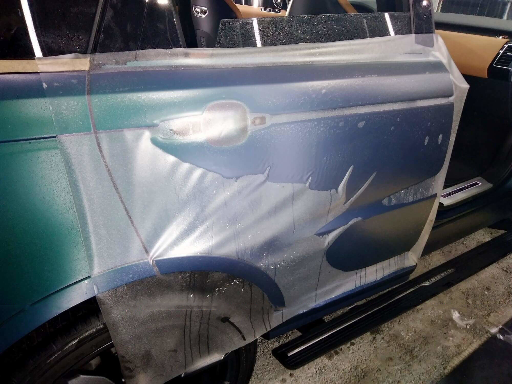 3. Завершив сушку, мастер вновь наносит на автомобиль специальный мыльный раствор, позволяющий деактивировать клеевую основу пелёнки. Благодаря этому. Специалист имеет возможность качественно уложить пленку в соответствии с формами кузова автомобиля;
